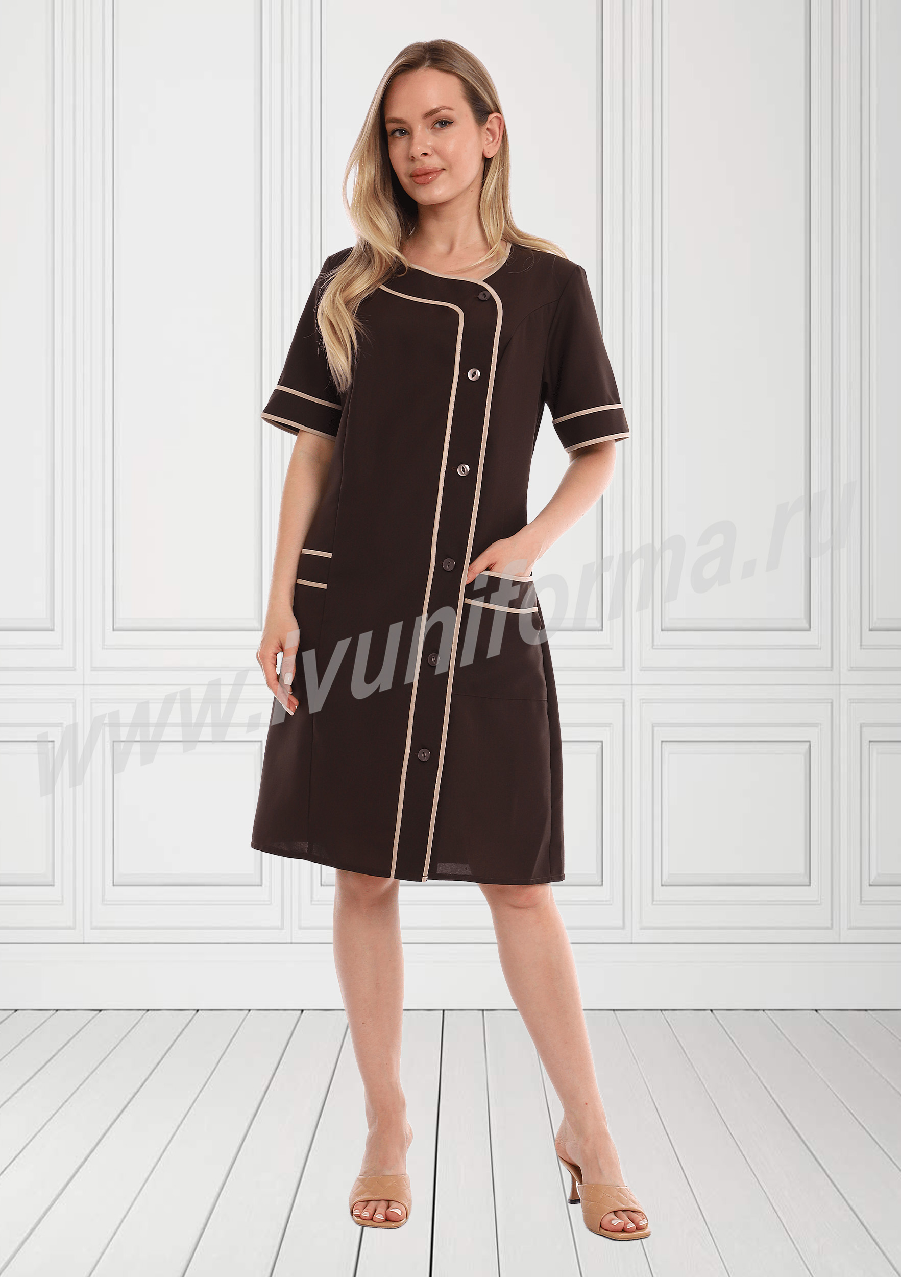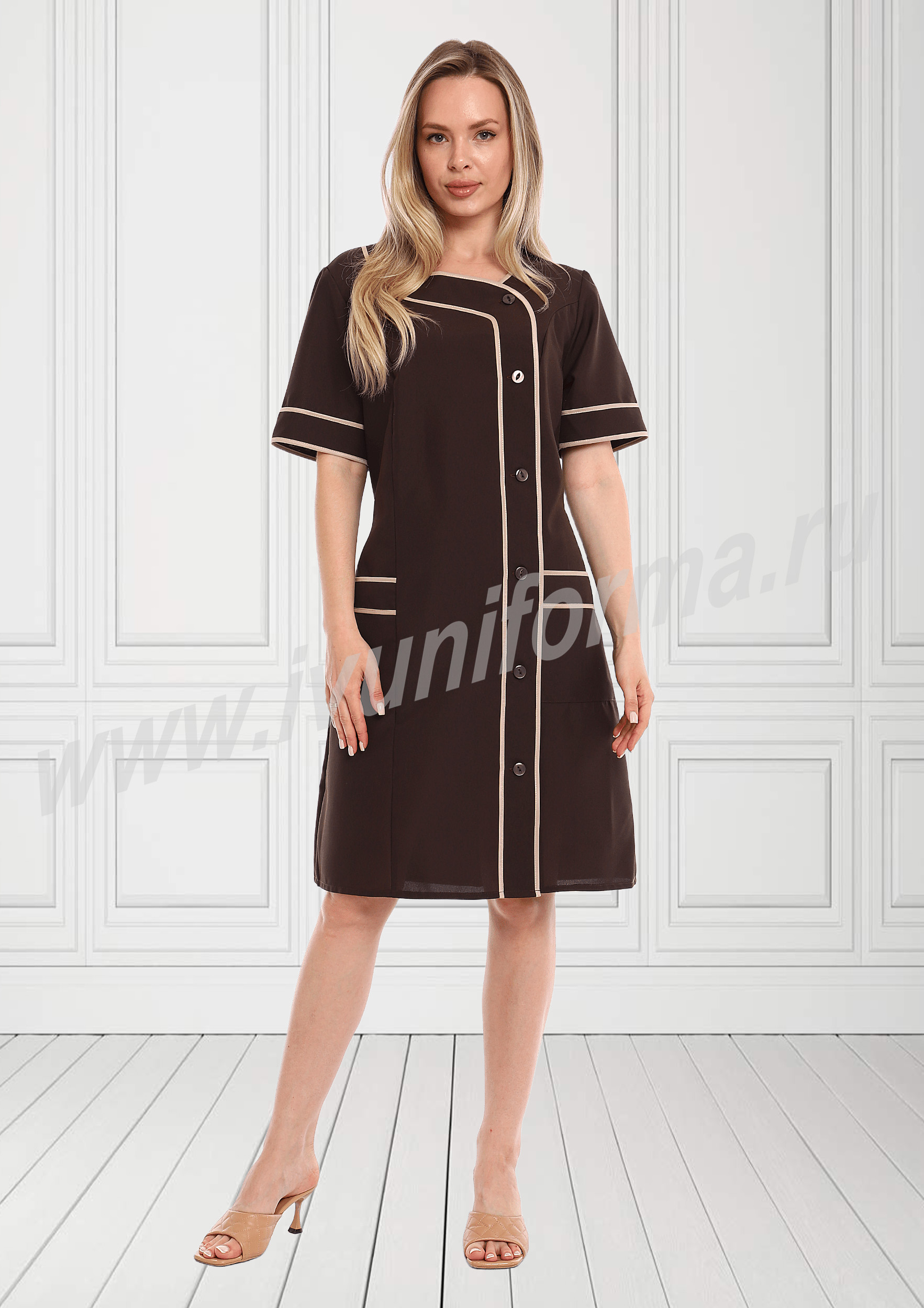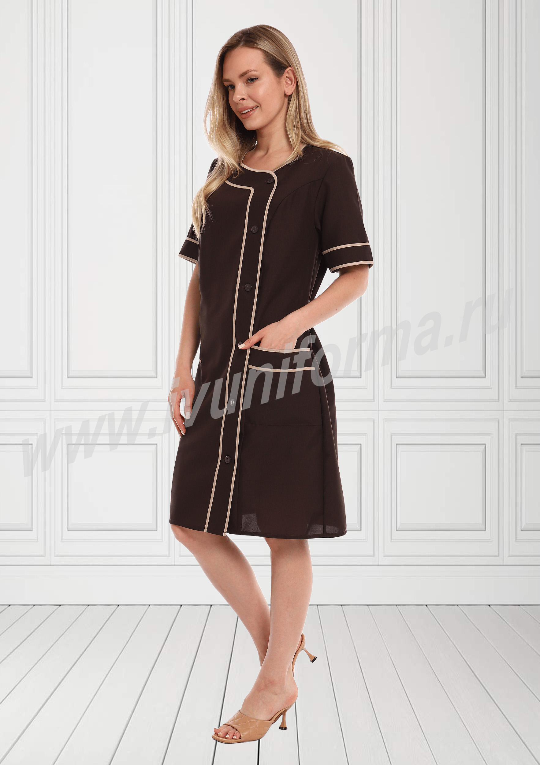 Халат женский средней длины прямого силуэта со смещенной бортовой застежкой на петли и пуговицы. Полочка с рельефами, выходящими из пройм, в нижней части расположены вместительные накладные карманы с отделкой. Спинка со средним швом. Рукав короткий втачной, по низу рукава выполнена отделка контрастным кантом. Объем по линии талии регулируется двумя полупоясами. Все срезы халата обработаны нейлоновым кантом, контрастный цвет которого создает эффектный вид изделия. Халат удобен и прост в уходе, предназначен для защиты от общих производственных загрязнений.