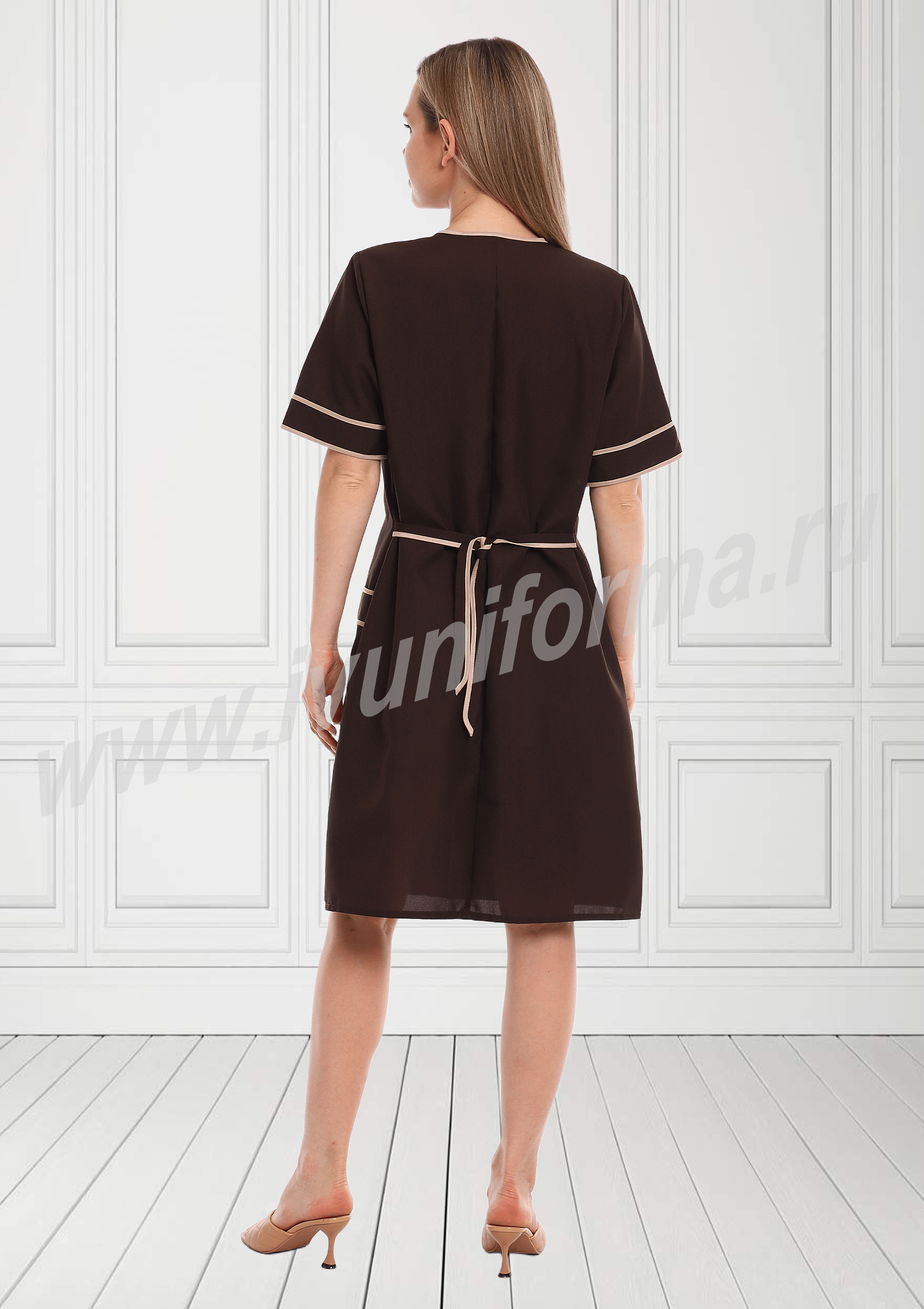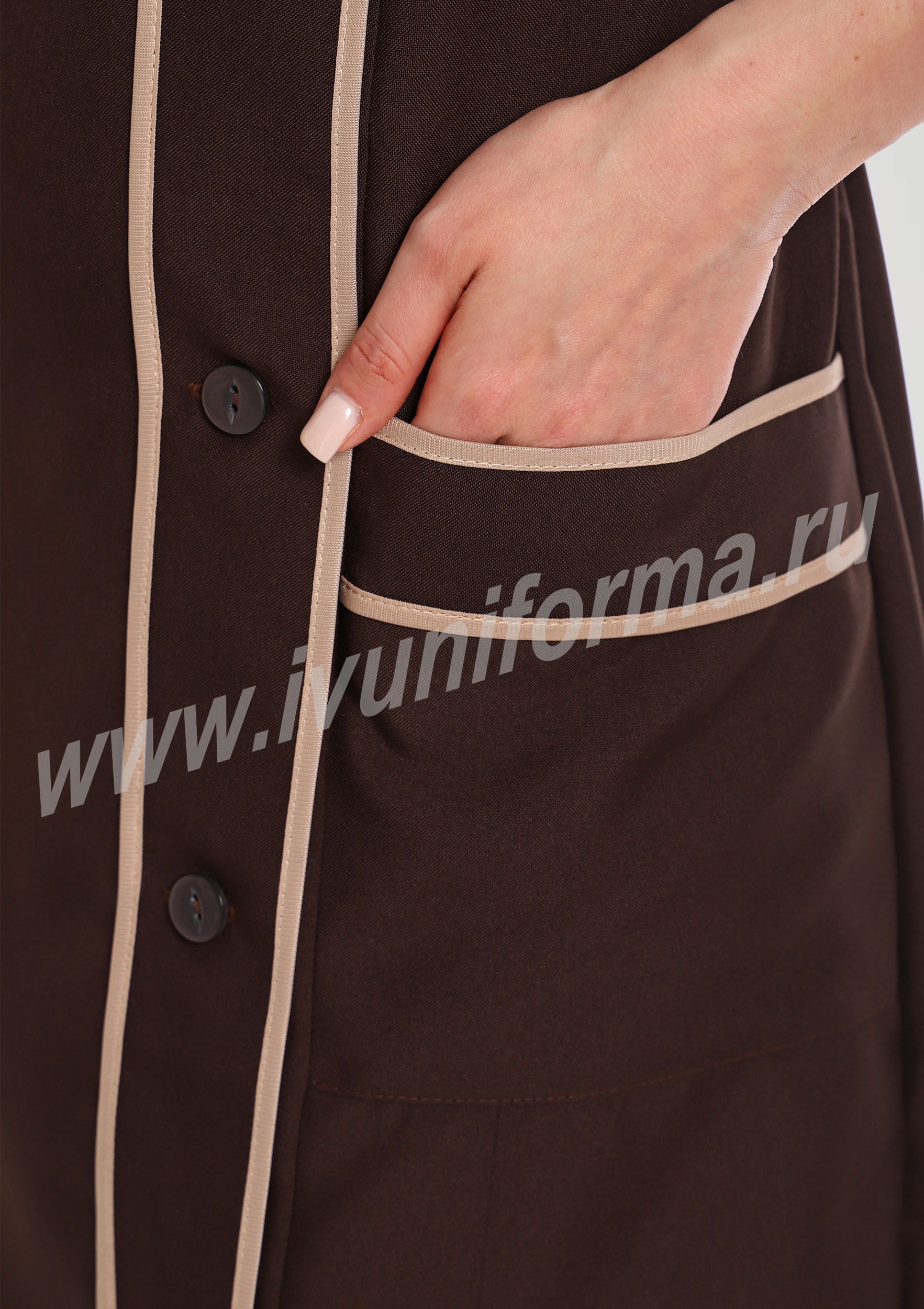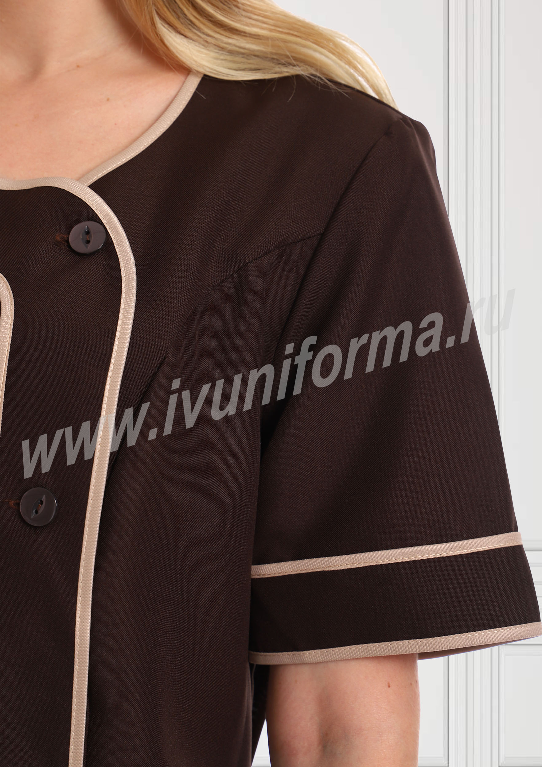 Халат женский средней длины прямого силуэта со смещенной бортовой застежкой на петли и пуговицы. Полочка с рельефами, выходящими из пройм, в нижней части расположены вместительные накладные карманы с отделкой. Спинка со средним швом. Рукав короткий втачной, по низу рукава выполнена отделка контрастным кантом. Объем по линии талии регулируется двумя полупоясами. Все срезы халата обработаны нейлоновым кантом, контрастный цвет которого создает эффектный вид изделия. Халат удобен и прост в уходе, предназначен для защиты от общих производственных загрязнений.