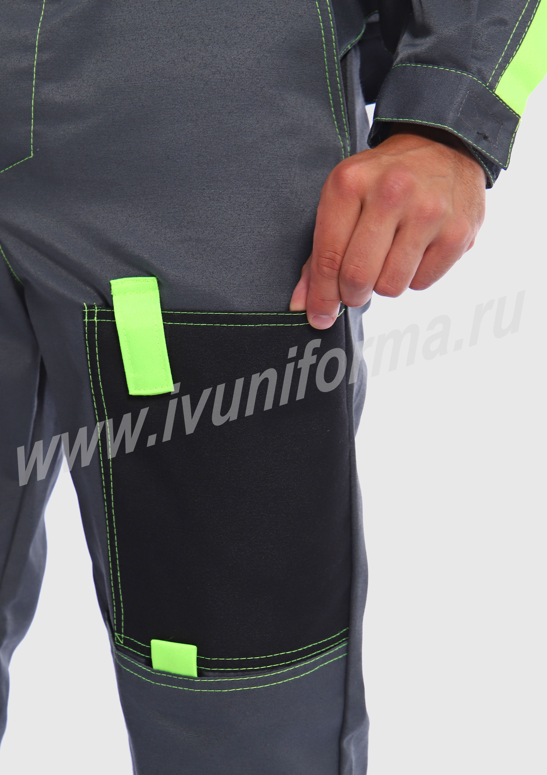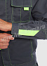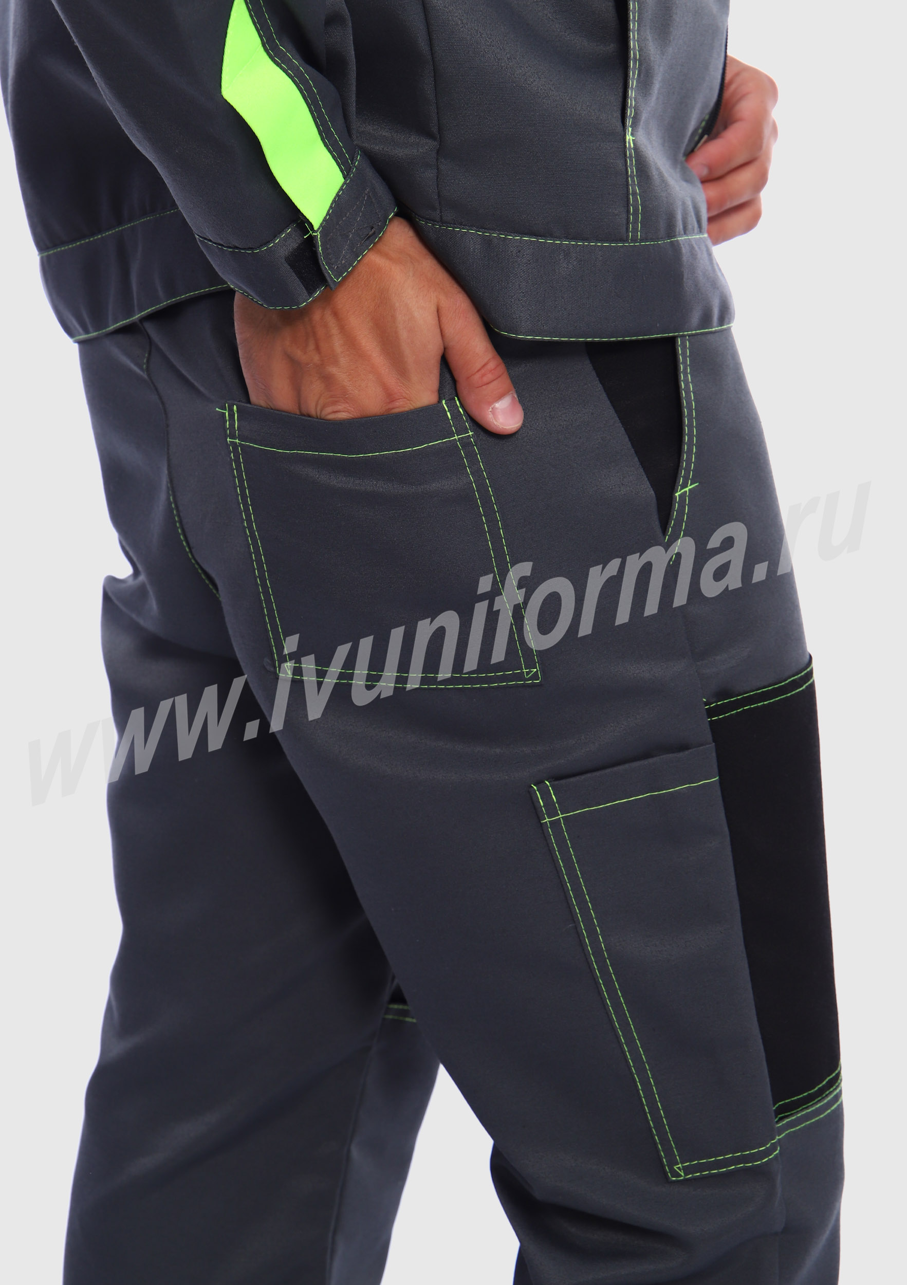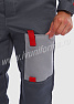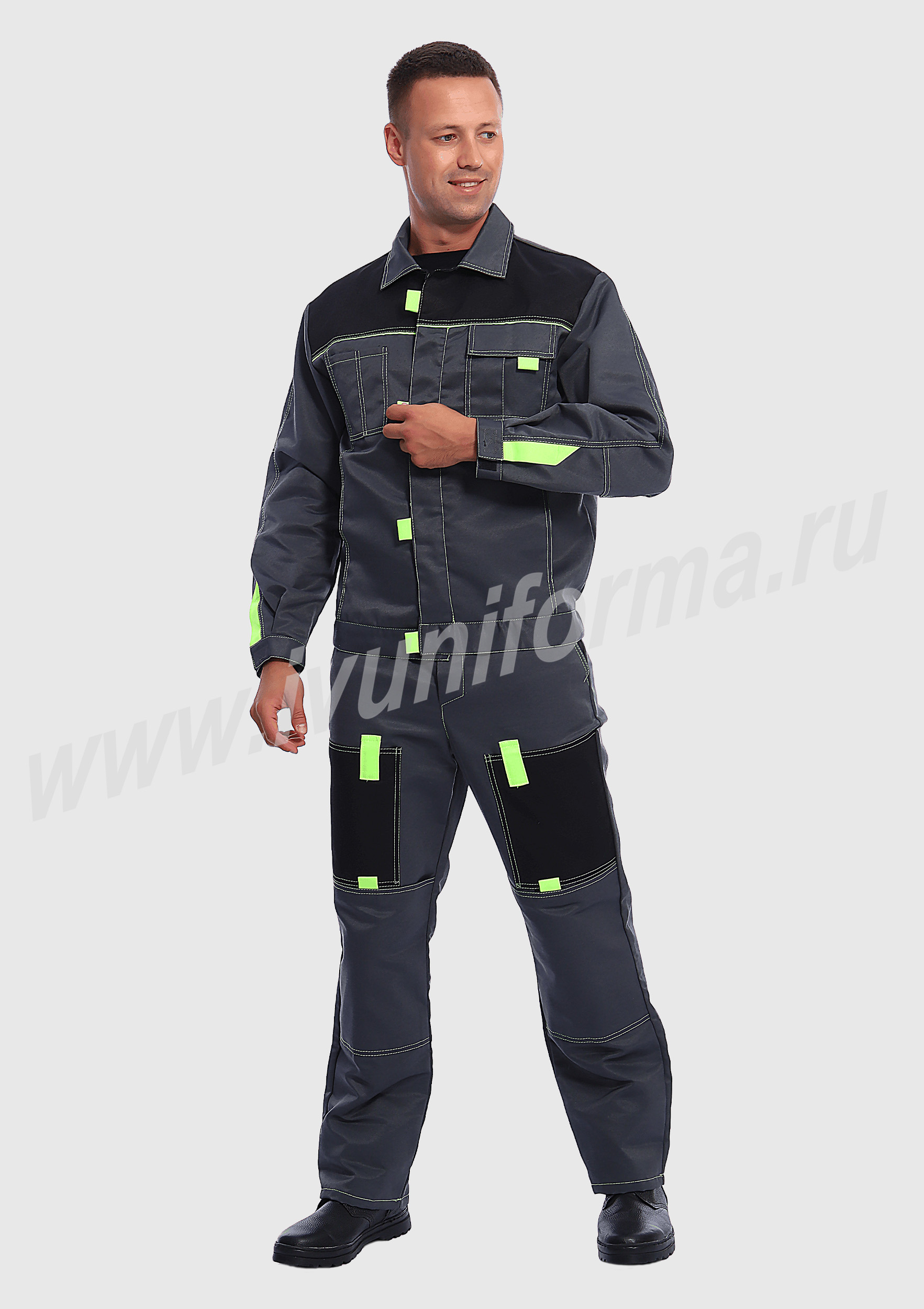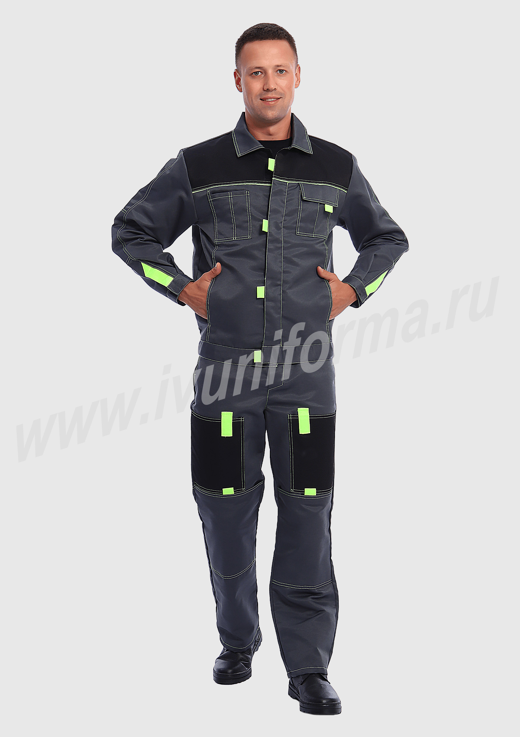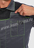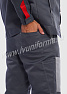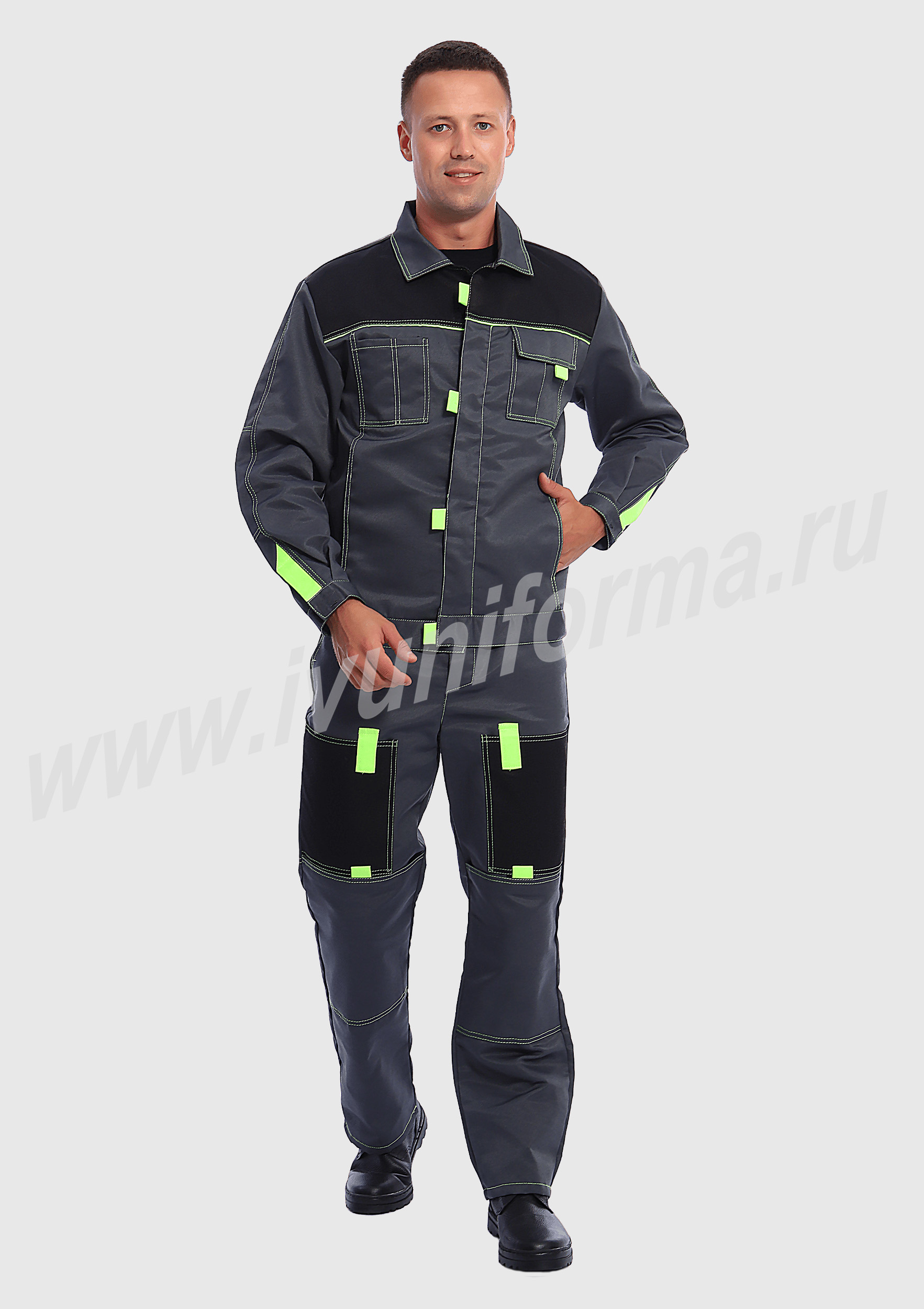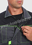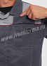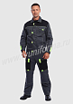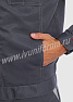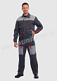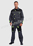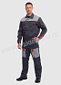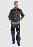 Костюм мужской состоит из куртки и брюк. Куртка укороченная с центральной застежкой на молнию и отложным воротником. Верхний левый карман куртки с клапаном, застегивается на липучку, правый - накладной. Два нижних боковых кармана в вертикальных швах. Брюки прямые на поясе, со шлевками под ремень. На брюках несколько функциональных карманов. Костюм усилен налокотниками и наколенниками и предназначен для защиты от общепроизводственных загрязнений и производственных травм.