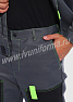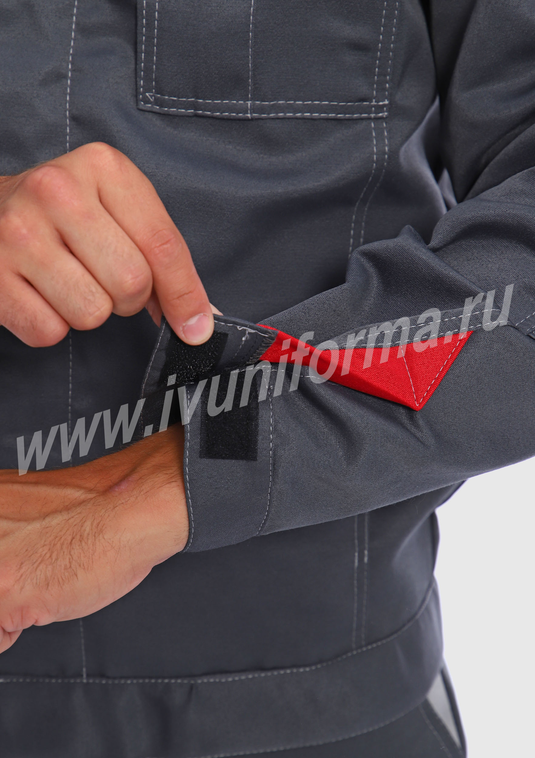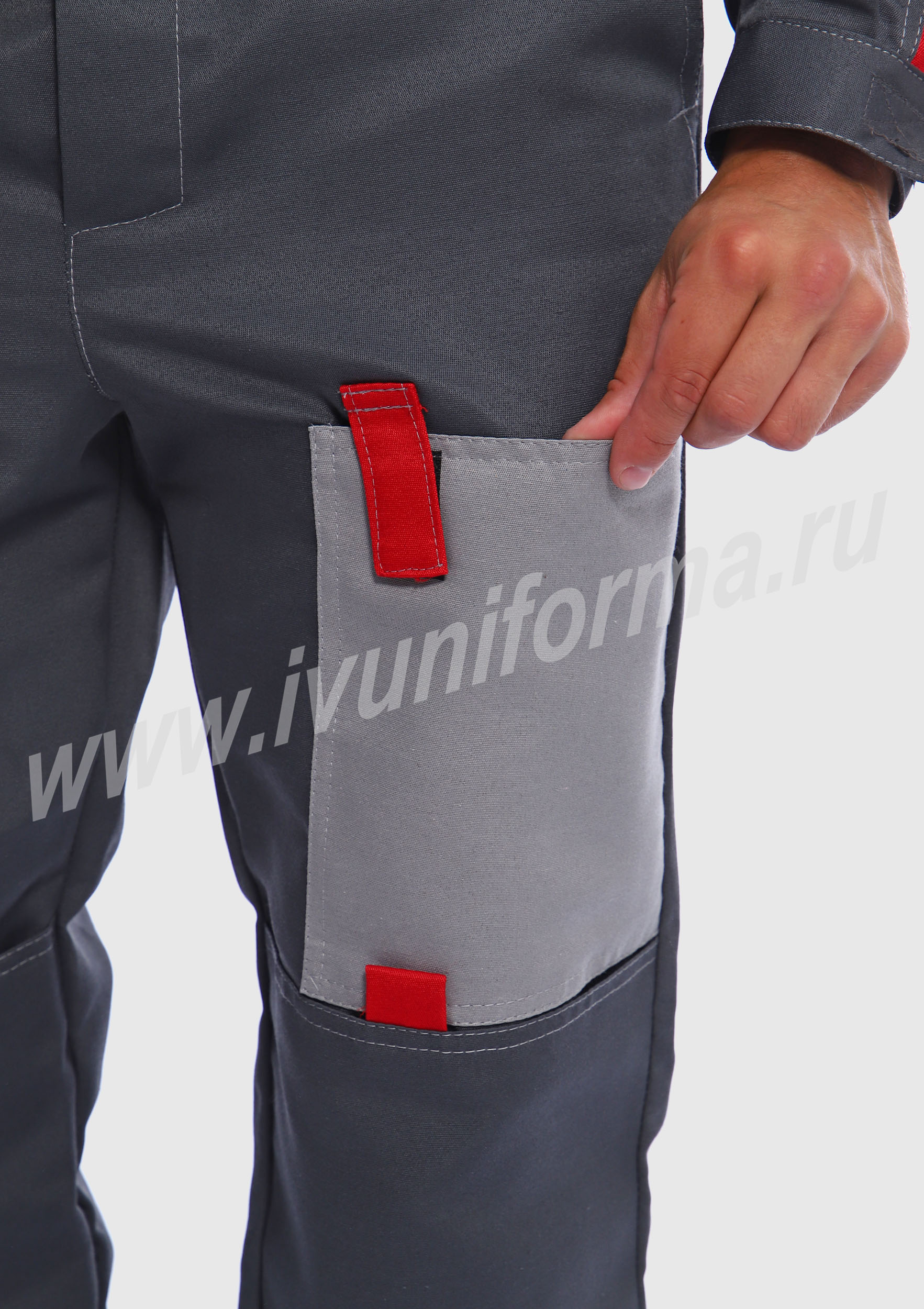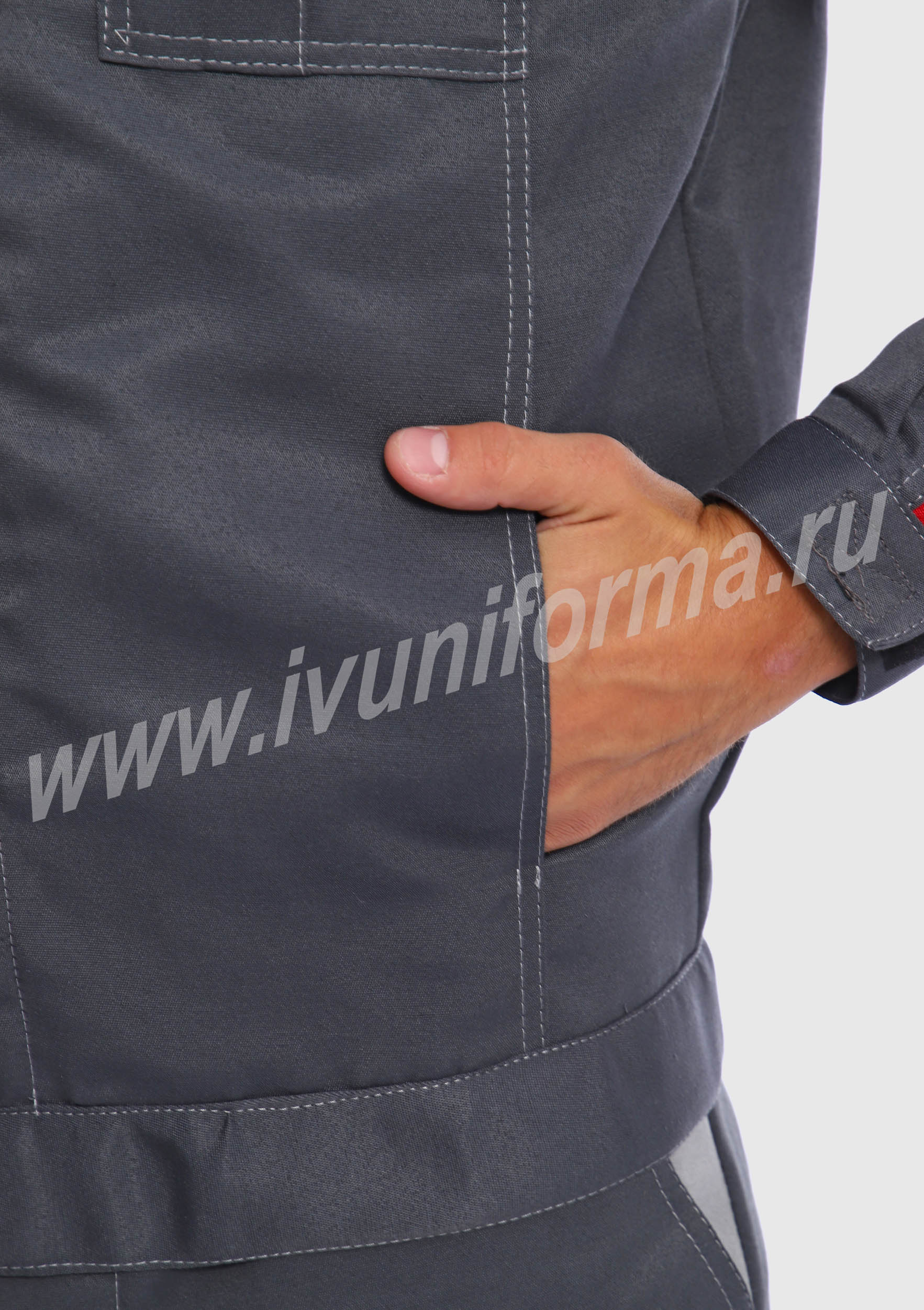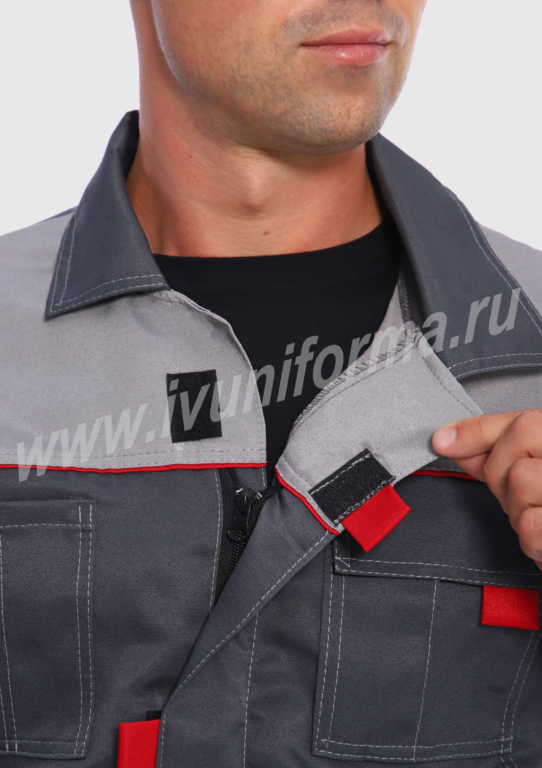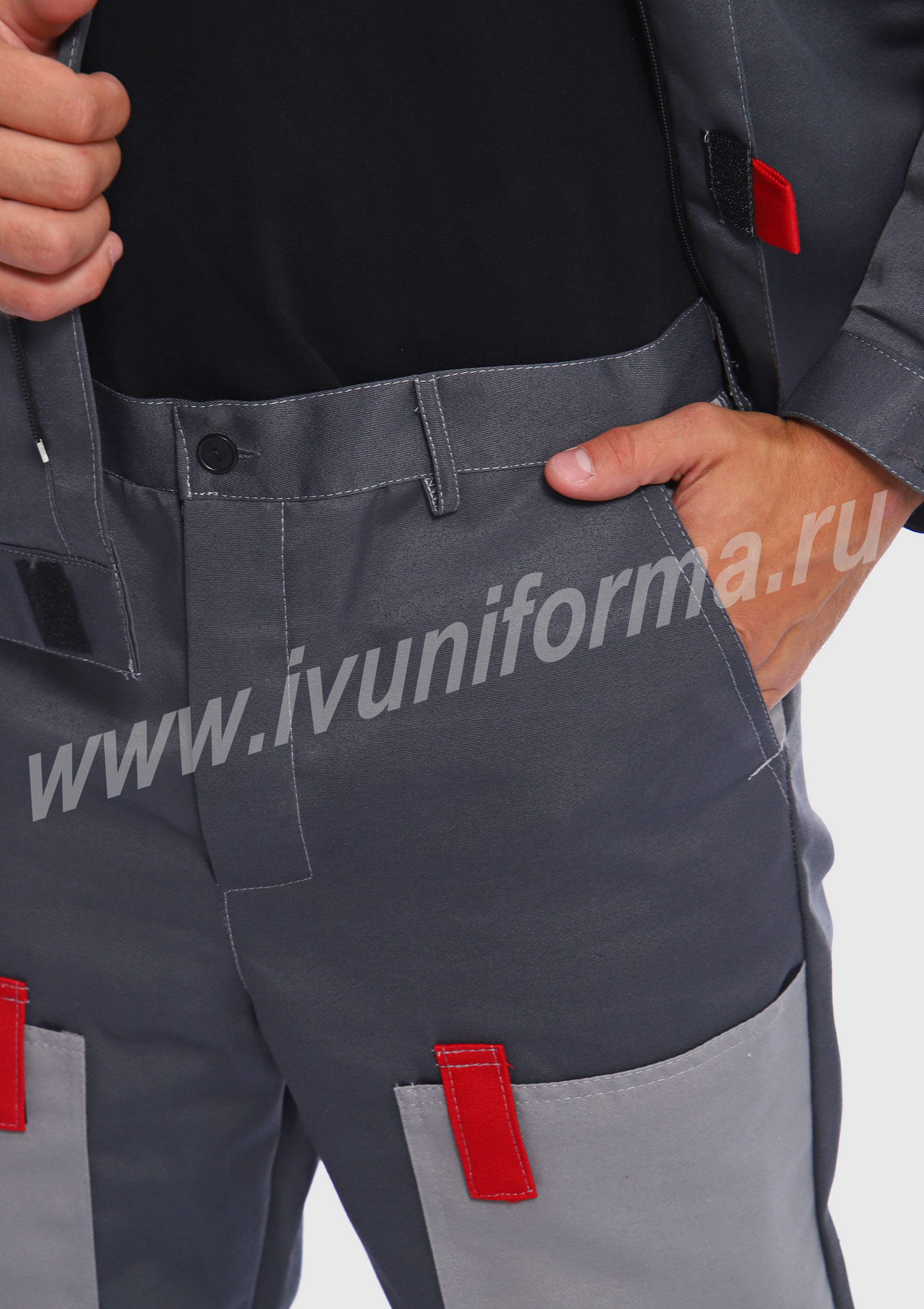 Костюм мужской состоит из куртки и брюк. Куртка укороченная с центральной застежкой на молнию и отложным воротником. Верхний левый карман куртки с клапаном, застегивается на липучку, правый - накладной. Два нижних боковых кармана в вертикальных швах. Брюки прямые на поясе, со шлевками под ремень. На брюках несколько функциональных карманов. Костюм усилен налокотниками и наколенниками и предназначен для защиты от общепроизводственных загрязнений и производственных травм.
